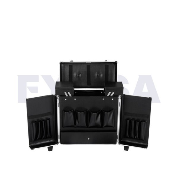 Puertas y múltiples compartimentos para almacenar, organizar o transportar peines, tijeras, cepillos, cortaúñas, botellas, aerosoles, rasuradoras, cuchillas y más.